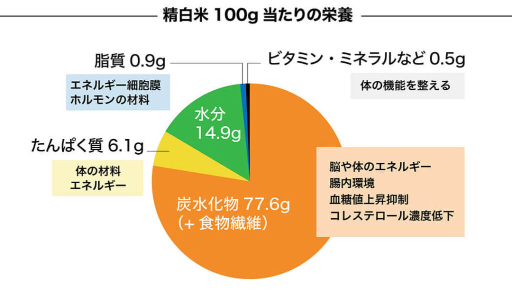白米には、エネルギー源となる炭水化物が豊富に含まれている。具体的には、100グラムあたり約炭水化物77グラムの栄養素がある。これは、私たちが日常生活を送るために欠かせないエネルギーを供給する。ビタミンB群やミネラルも存在し、特にビタミンB1はエネルギー代謝に重要な役割を果たす。また、消化が良く、腹持ちもよいため、ダイエット中でも空腹感を和らげてくれる。